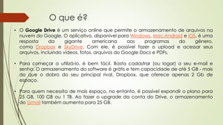 O documento descreve o Google Drive, um serviço de armazenamento na nuvem que permite armazenar e editar arquivos online. Ele oferece 5GB de espaço grátis e permite compartilhar arquivos publicamente ou com usuários selecionados. Também destaca que o Google Drive pode ser uma ferramenta útil para professores, pois permite criar enquetes e questionários interativos com recursos multimídia.