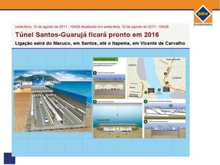 O documento fornece informações sobre a SRW, uma construtora fundada em 1990 que já construiu mais de 358.000 m2 de área e possui mais de 64.000 m2 em construção. Também fala sobre o início das obras do VLT em Santos em junho e sobre investimentos no porto da cidade devido ao pré-sal.