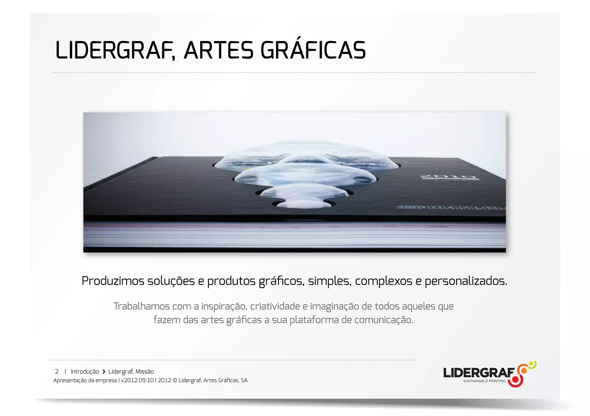 A Lidergraf é uma empresa portuguesa de artes gráficas que fornece soluções de impressão, acabamento e logística. Ela possui maquinaria avançada de impressão offset, digital e rotativa e tem capacidade para impressão de livros, catálogos, revistas e outros materiais. A Lidergraf enfatiza a gestão de cor, sustentabilidade e qualidade em todos os seus processos.