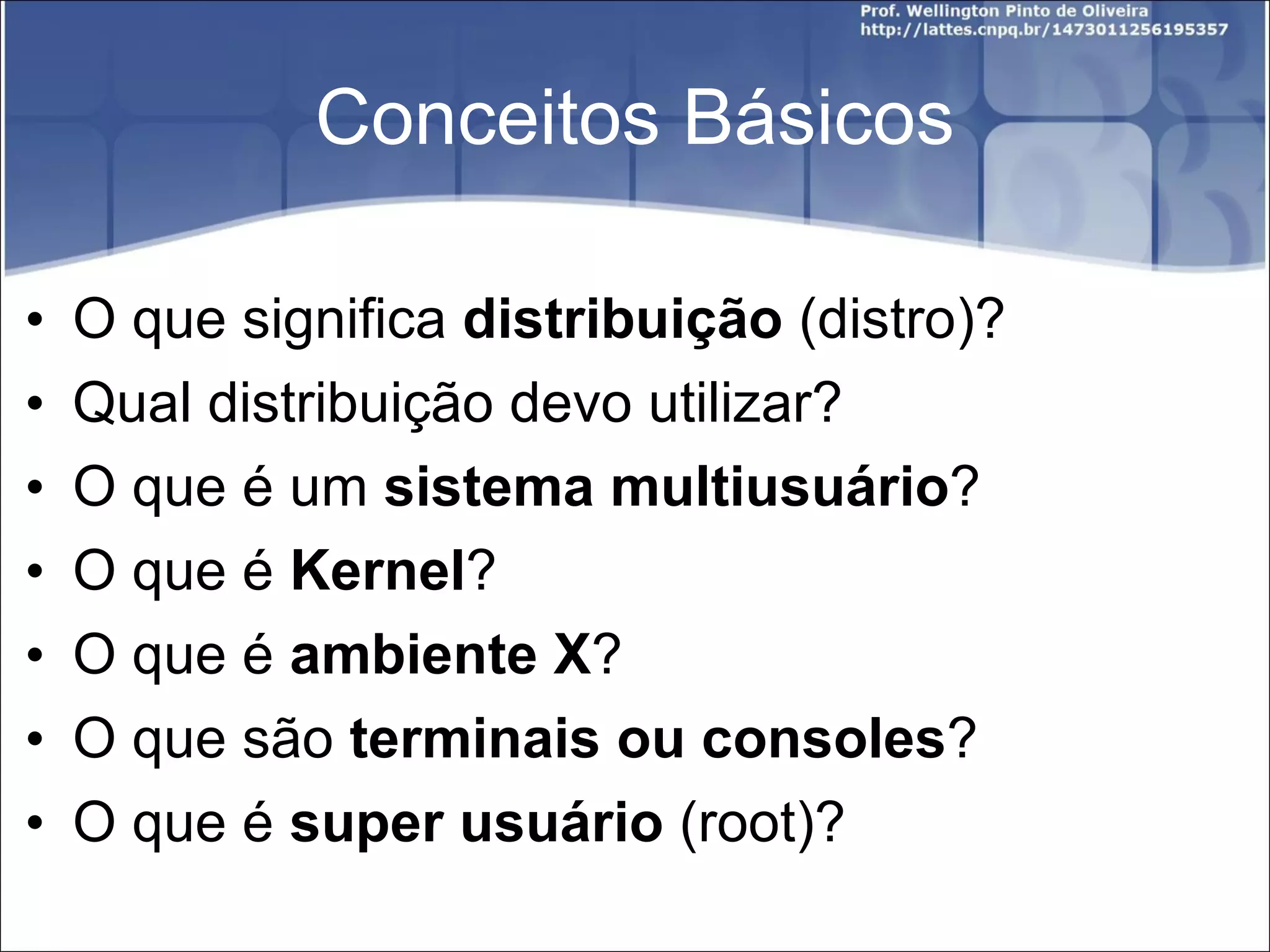 O documento fornece uma introdução sobre conceitos básicos do sistema operacional Linux, incluindo distribuições, sistemas multiusuários, kernel, ambiente X, terminais, super usuário e diretórios ocultos. Também explica sobre terminal de comandos, permissões de arquivos e diretórios, representação numérica de permissões, estrutura de diretórios e como executar aplicações no terminal.