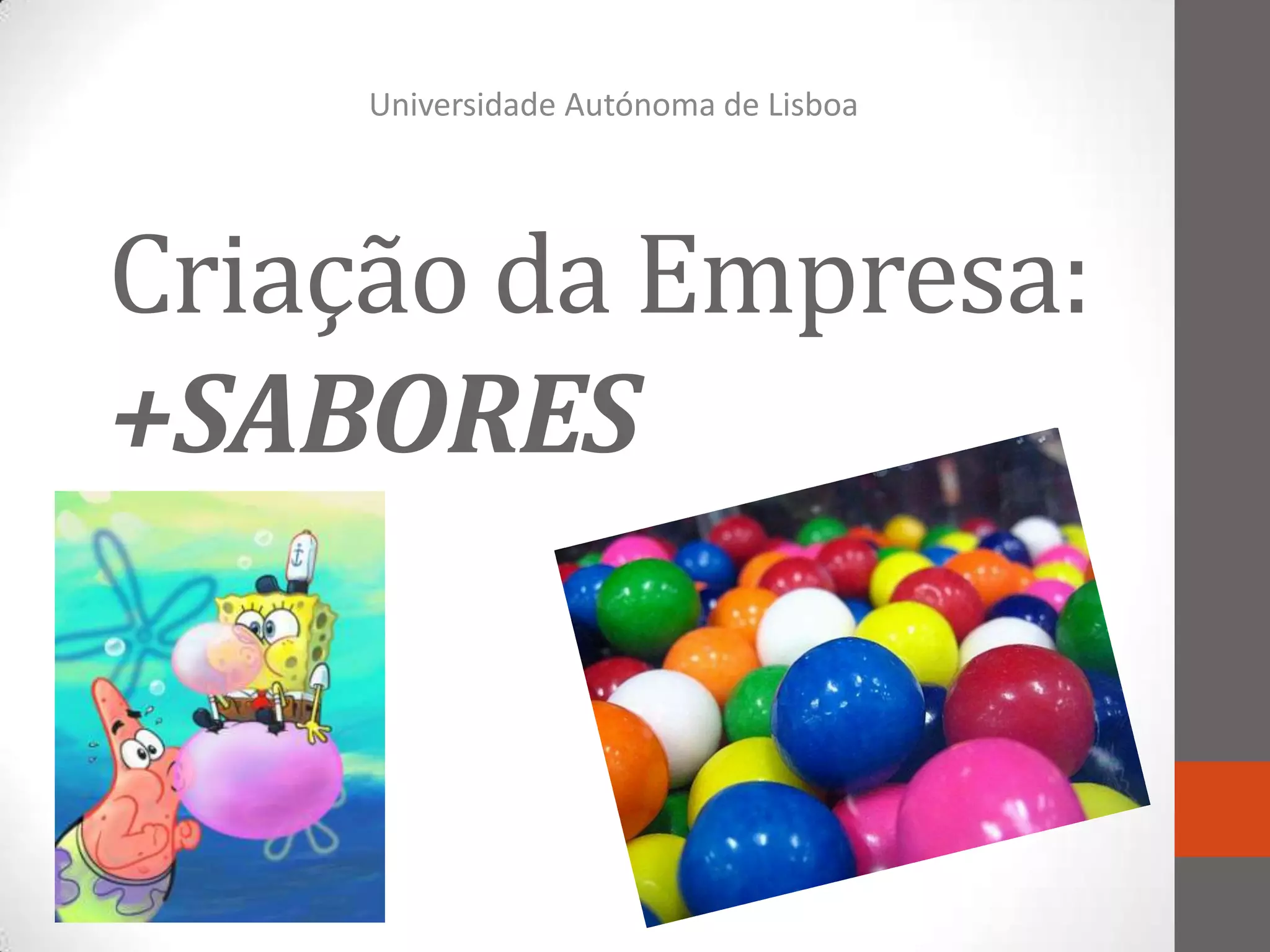 Este documento descreve a criação da empresa +SABORES, que produzirá pastilhas elásticas ecológicas em vários sabores. A empresa será sediada em Lisboa e terá como objetivo a produção, embalagem e distribuição do produto em Portugal. A +SABORES definirá estratégias de preço e comunicação para introduzir o novo produto no mercado e conquistar quota de mercado.