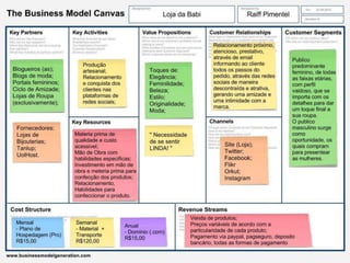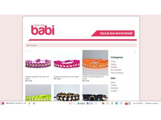 O documento descreve uma loja de bijuterias artesanais voltada para mulheres vaidosas. A loja oferece pulseiras de fios de seda com detalhes como cristais e strass a preços acessíveis, buscando satisfazer a necessidade das clientes de se sentirem lindas. A loja pretende alcançar as clientes por meio de seu site, redes sociais e parcerias com blogueiros e influenciadores digitais, oferecendo um atendimento personalizado.