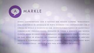 Este documento descreve os serviços de marketing jurídico oferecidos pela Markle, incluindo planejamento estratégico, marketing de relacionamento, gestão de websites e redes sociais, produção de newsletters e eventos, assessoria de imprensa, identidade visual e endomarketing.