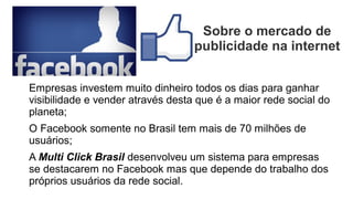 A Multi Click Brasil é uma empresa de marketing multinível que paga usuários para compartilhar publicidades no Facebook. Os usuários podem se tornar franqueados de nível Prata, recebendo R$40 semanais por compartilhamentos diários, ou de nível Ouro, recebendo R$200 semanais por mais compartilhamentos. A empresa também distribui bônus para quem indica novos membros.