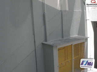 O documento apresenta diversos modelos de estruturas e componentes para instalações elétricas, incluindo modelos de abrigos para medidores e reguladores, quadros de medidores, passagens de ramais e prumadas. Além disso, fornece informações de contato de uma empresa que fabrica esses componentes.