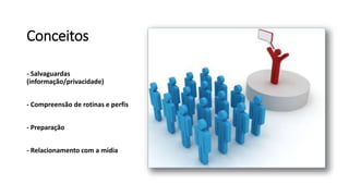 O documento discute conceitos e requisitos para treinamento de mídia, incluindo salvaguardas de informação, compreensão de rotinas jornalísticas, preparação para entrevistas, e relacionamento com a imprensa. Ele também cobre tópicos como atitude profissional durante entrevistas, organização de informações, e características de diferentes veículos de mídia como rádio, TV, jornais e redes sociais.