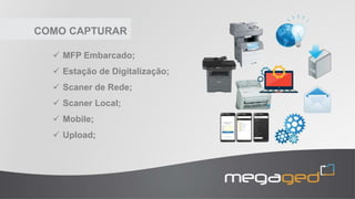 Este documento descreve as funcionalidades do sistema MegaGED de gestão eletrônica de documentos, incluindo recursos para captura, indexação, busca, fluxos de aprovação e armazenamento de documentos físicos e digitais. O sistema permite digitalizar e organizar documentos de forma segura para aumentar a produtividade dos usuários.
