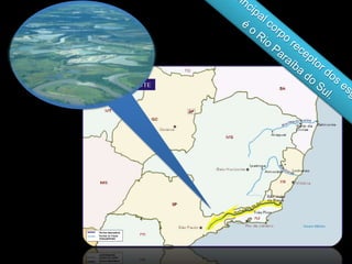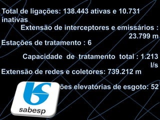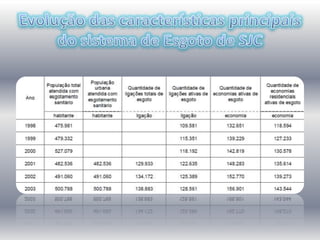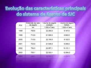 O documento descreve como funciona o sistema de coleta e tratamento de esgoto em São José dos Campos, Brasil. O município tem 86% de sua área urbanizada coberta por redes coletoras de esgoto. Entre 1995-2007, o percentual de esgoto tratado aumentou de 10% para 46%. O esgoto é coletado por 743km de rede e levado para tratamento em 6 estações. As taxas de coleta e tratamento variam entre as diferentes bacias da cidade.