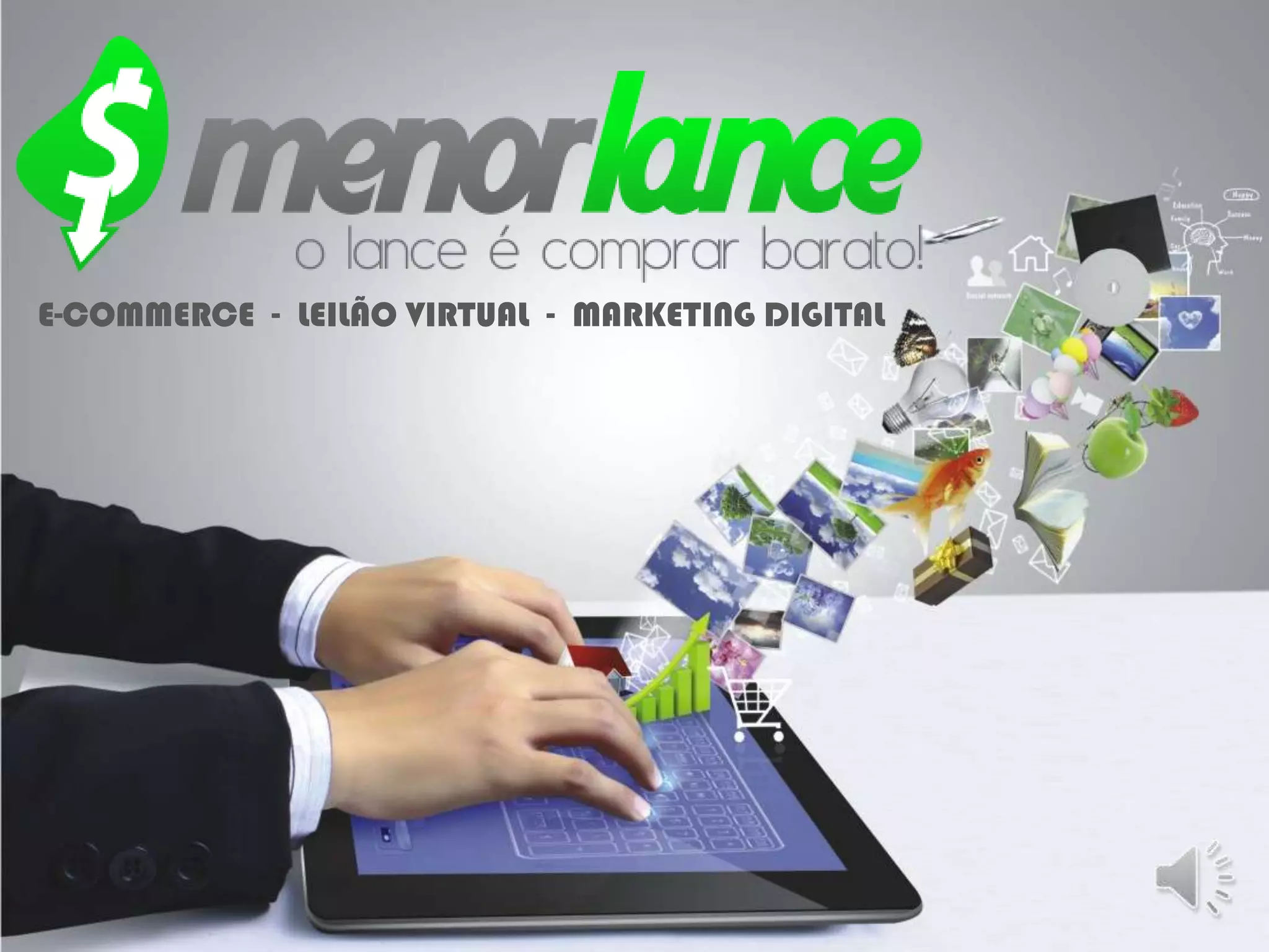 O documento apresenta a empresa Menor Lance, operando no e-commerce e leilão virtual desde 2012, com foco em marketing digital e mais de 400.000 usuários. A Menor Lance oferece um modelo de negócios que permite aos clientes participar de leilões a preços baixos, enquanto compartilha lucros e bonificações. A empresa destaca um plano de marketing inovador, promovendo oportunidades de ganhos através da indicação de novos usuários e participação em um sistema de comissões.