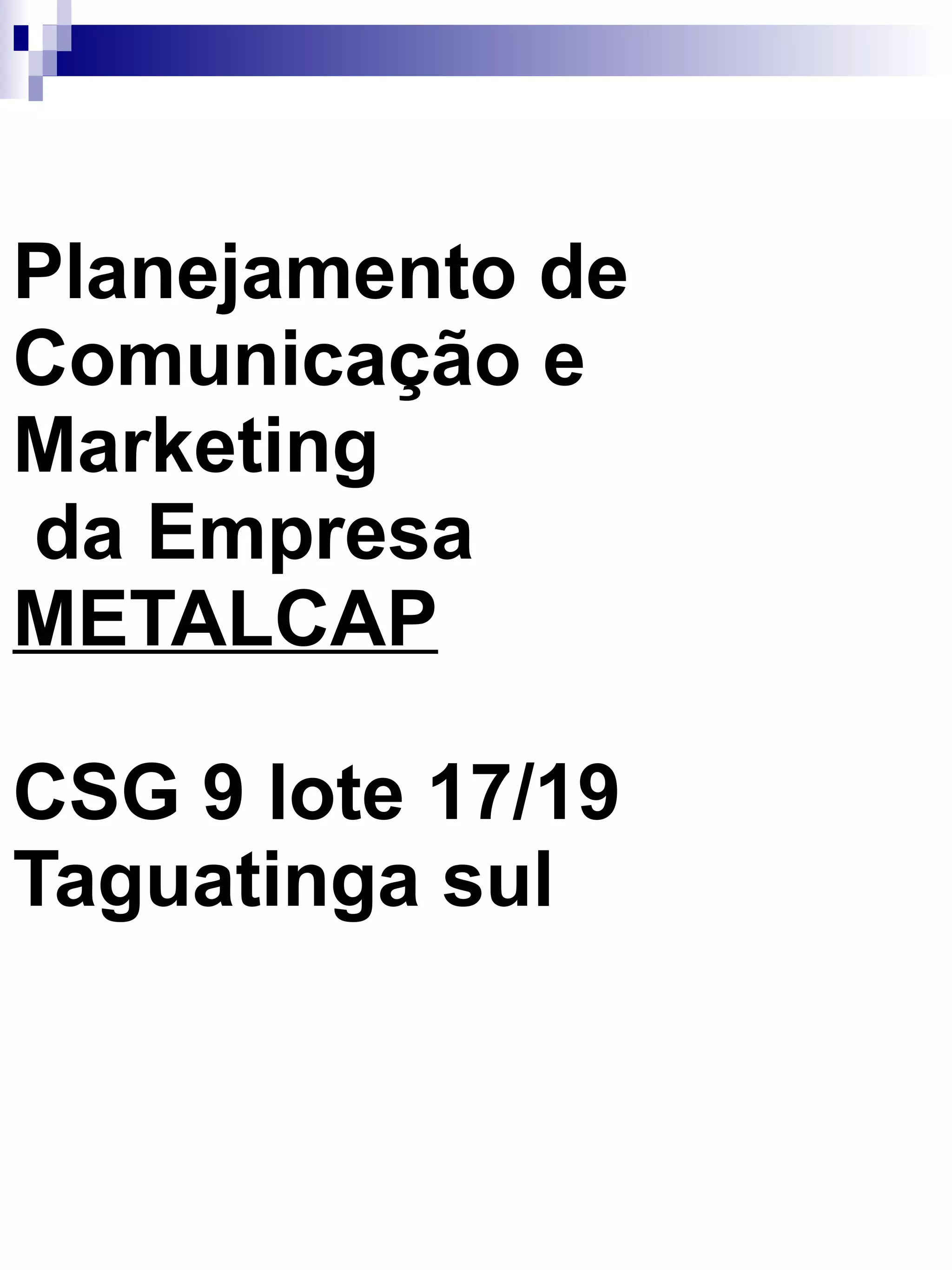A Metalcap CSG é uma empresa de reciclagem fundada em 1992 em Taguatinga, Brasília. Ela recicla metais como ferro, cobre e alumínio. Seus principais sócios são Biagio Santoro e João Foster. A empresa investe em maquinários modernos, mas precisa melhorar sua comunicação interna e marketing para enfrentar a concorrência e variações no mercado.