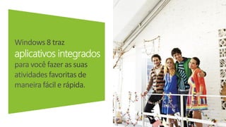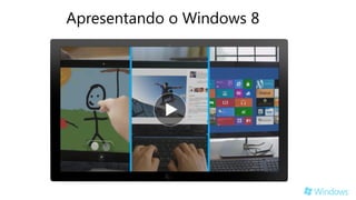 O documento apresenta o Windows 8, destacando seus principais recursos, como a tela inicial com blocos dinâmicos, aplicativos e conexão com a nuvem através do Skydrive. Inclui informações sobre as versões do Windows 8 disponíveis, opções de compra e um programa de upgrade promocional para usuários do Windows 7. Além disso, descreve os requisitos básicos para realizar o upgrade e os benefícios do sistema para usuários domésticos e corporativos.