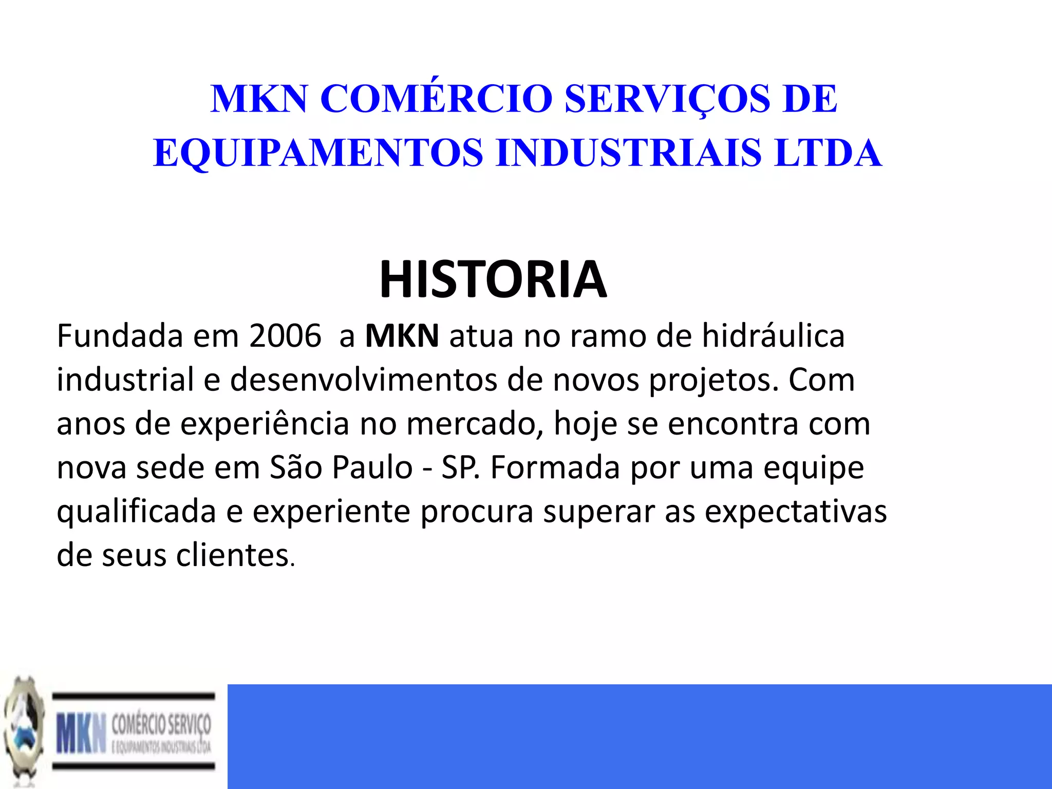 A MKN é uma empresa fundada em 2006 que atua no ramo de hidráulica industrial em São Paulo. Ela oferece serviços de manutenção, reforma e montagem de equipamentos hidráulicos, como bombas, válvulas, cilindros e mangueiras de alta pressão, visando oferecer soluções inovadoras com qualidade e agilidade.