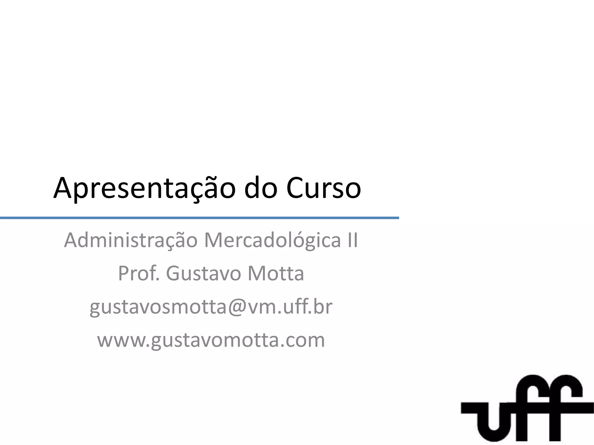 Este documento apresenta o curso de Administração Mercadológica II ministrado pelo professor Gustavo Motta. Apresenta as credenciais acadêmicas e experiência profissional do professor, o objetivo e ementa da disciplina, os objetivos de aprendizagem, pré-requisitos e referências bibliográficas.