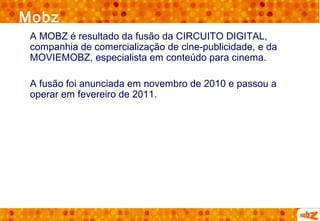 A Mobz é uma fusão entre Circuito Digital e Moviemobz, focando na distribuição de conteúdo cinematográfico sob demanda. A empresa oferece diversas experiências de cinema, incluindo a promoção de eventos especiais e vendas coletivas de ingressos, interagindo com fãs através das redes sociais. O portal da Mobz visa conectar expositores e o público, facilitando a demanda por filmes alternativos e shows ao vivo em cinema.