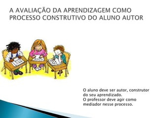 O documento discute a avaliação da aprendizagem como um processo construtivo no qual o aluno é o autor de seu próprio aprendizado, com o professor atuando como mediador. A avaliação deve ocorrer durante o processo de aprendizagem para fornecer feedback e diagnosticar dificuldades, em vez de ser eliminatória. Há duas modalidades de avaliação: de certificação para objetos concluídos e de acompanhamento para objetos em construção.