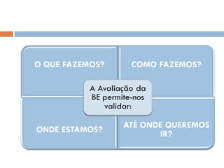Este documento descreve um modelo de autoavaliação para bibliotecas escolares. O modelo permite avaliar o impacto da biblioteca no ensino e aprendizagem, a eficiência dos serviços e a satisfação dos utilizadores. Organiza-se em quatro domínios e subdomínios e fornece indicadores e perfis de desempenho para avaliar cada área. O processo envolve a recolha de evidências e a identificação de pontos fortes e fracos para melhoria contínua.