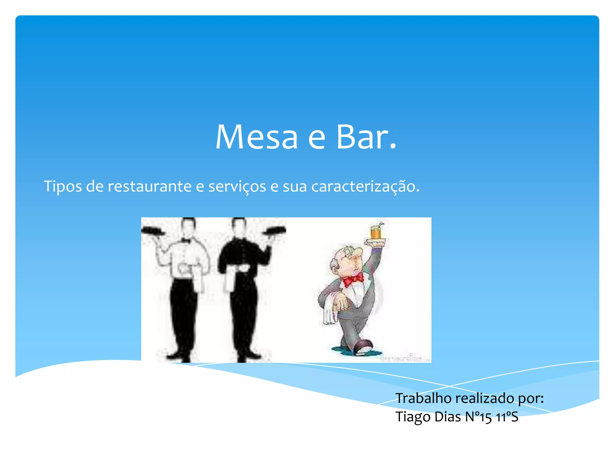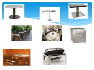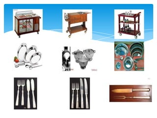 Este documento descreve tipos de restaurantes e serviços, incluindo restaurantes de turismo, hotel, clássico, típico e dietético. Também discute o material necessário em restaurantes como mobiliário, maquinaria e talheres. Por fim, explica diferentes métodos de serviço como à francesa, inglesa direta e indireta.
