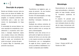 Este documento descreve um projeto de parceria entre organizações de vários países da Europa para transferir uma prática inovadora de apoio ao emprego de longa duração da Inglaterra para outros países. O projeto Mojo visa envolver 20 desempregados de longa duração através de academias de emprego personalizadas para melhorar suas habilidades e motivação para encontrar trabalho.