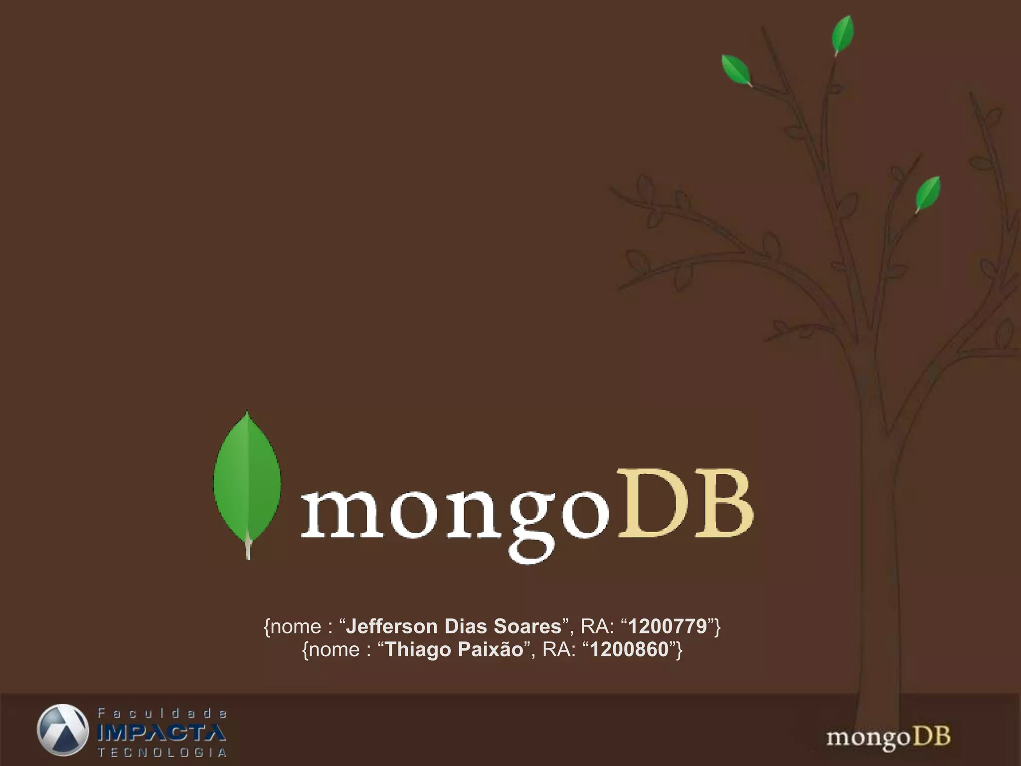 O documento discute o MongoDB, um banco de dados NoSQL orientado a documentos. Ele é projetado para problemas que não são facilmente resolvidos por RDBMS tradicionais e pode escalar em muitos servidores. Ele armazena dados como documentos JSON e suporta alta performance, consulta dinâmica e armazenamento eficiente de dados binários.