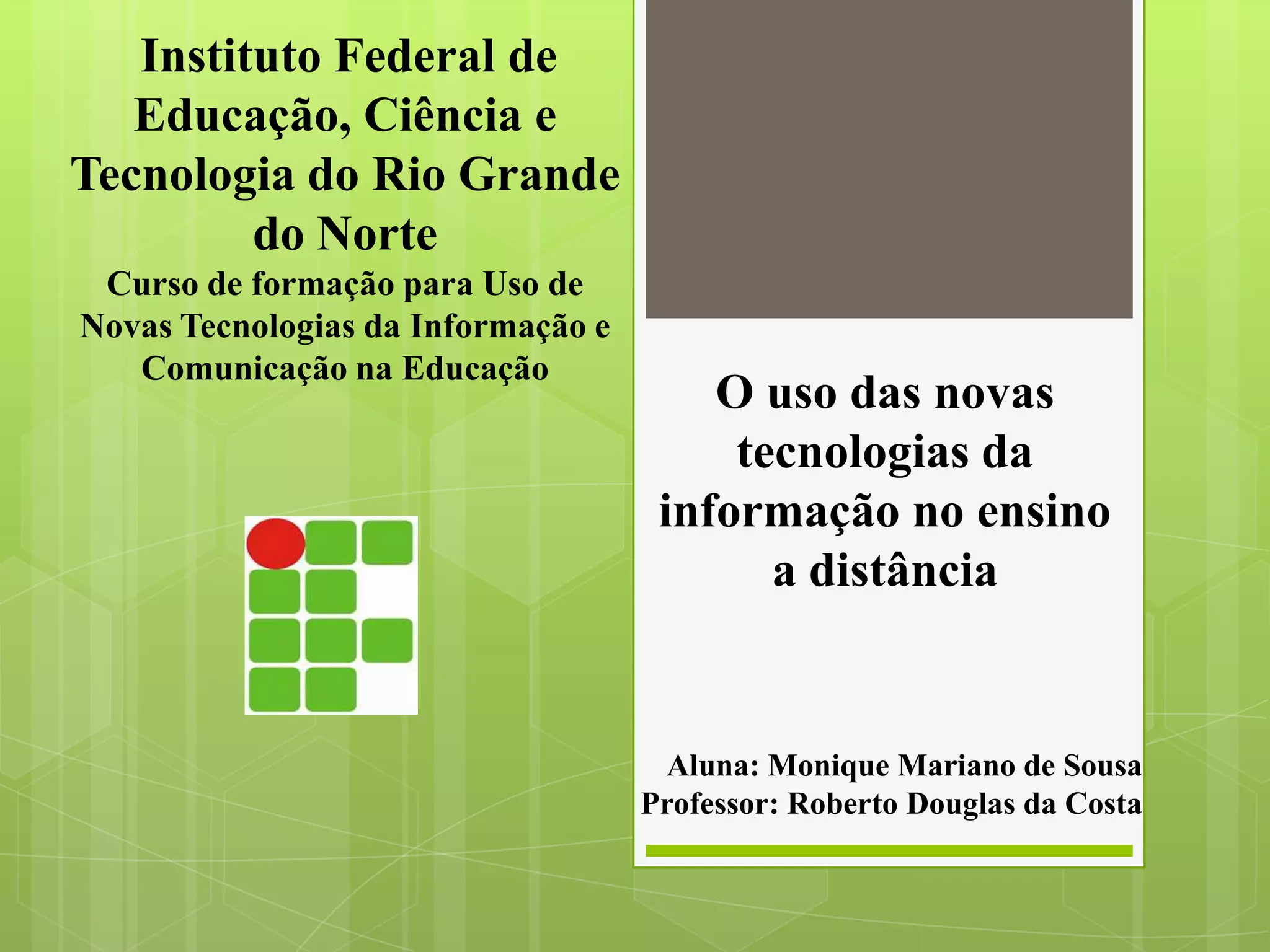 O documento discute o uso das novas tecnologias da informação e comunicação (NTICs) na educação a distância. Apresenta o que é educação a distância e NTICs, e como as NTICs possibilitam o desenvolvimento do ensino presencial e a distância de forma dinâmica e interativa, tornando a aprendizagem mais significativa.