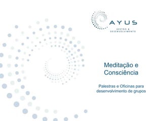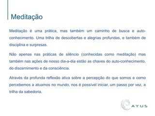 Este documento discute meditação e consciência, oferecendo palestras e oficinas sobre esses tópicos. A meditação é descrita como uma prática de autoconhecimento e sabedoria. O Vedanta Advaita é apresentado como um caminho de compreensão da realidade através da consciência pessoal. São oferecidas palestras gratuitas sobre meditação e oficinas personalizadas. O documento fornece detalhes sobre a direção de Marcos Thiele.