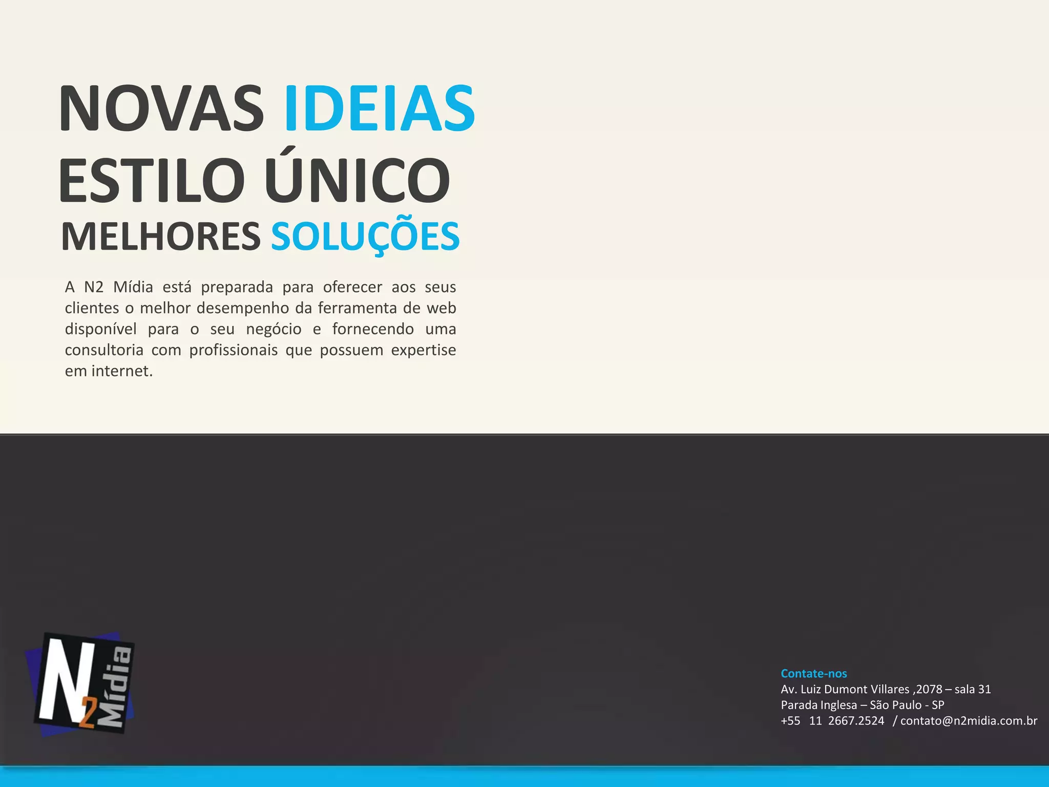 A N2 Mídia oferece serviços de marketing digital, como desenvolvimento de sites, otimização para mecanismos de busca e gerenciamento de mídias sociais, para ajudar os clientes a alavancar seus negócios online. A empresa conta com profissionais experientes e realiza uma análise cuidadosa das necessidades de cada cliente para desenvolver as melhores soluções.