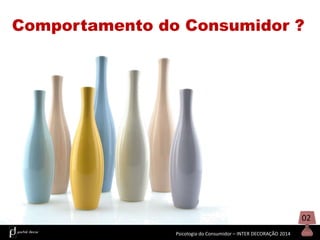 Este documento discute a psicologia do consumidor no contexto da decoração de interiores. Aborda os diferentes tipos de orientação de compra, como utilitária versus hedónica, e as razões pessoais, sociais e econômicas para a decoração. Também discute o papel do decorador em entender as motivações manifestas e latentes do cliente e como a decoração pode refletir o autoconceito do cliente.
