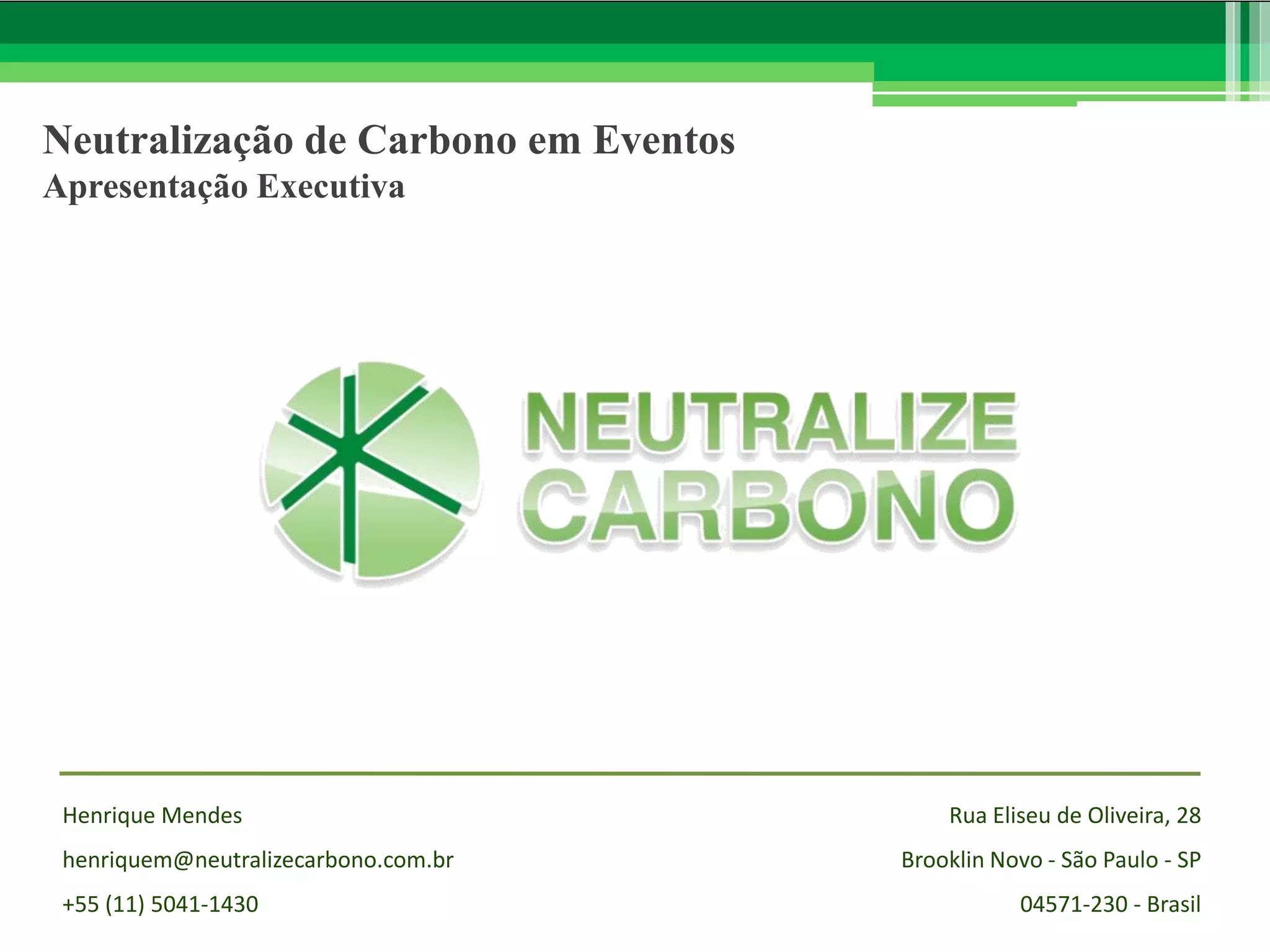 [1] A Neutralize Carbono é a primeira empresa no Brasil a oferecer a neutralização de carbono por meio de créditos de carbono para eventos. [2] O processo envolve calcular as emissões do evento e investir em créditos de carbono equivalentes para compensá-las. [3] Isso fornece garantia e credibilidade aos organizadores que buscam reduzir o impacto ambiental de seus eventos.