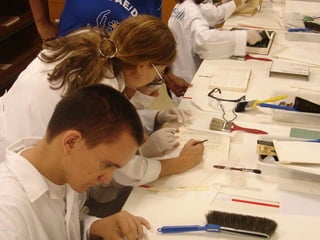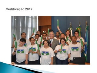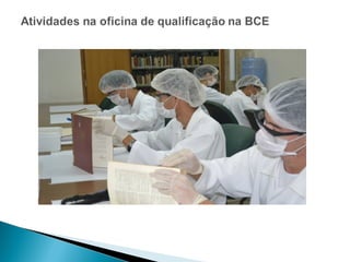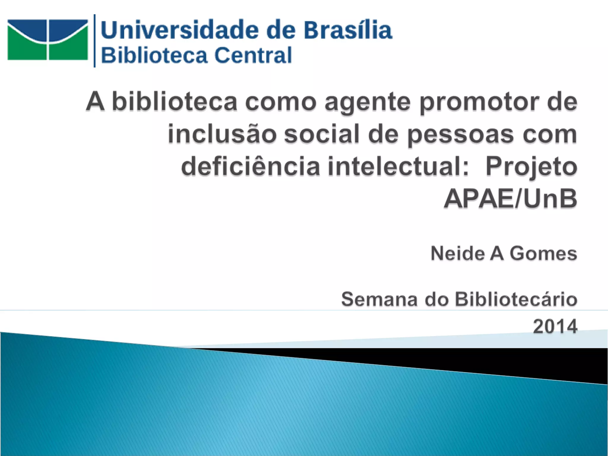 O documento discute o papel das bibliotecas na sociedade da informação como agentes de transformação social através da educação para a cidadania e inclusão. Ele apresenta um projeto de parceria entre a APAE-DF e a Biblioteca Central da UnB que oferece treinamento profissional e emprego apoiado a pessoas com deficiência intelectual.