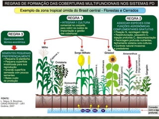 O documento discute os principais aspectos do Sistema Plantio Direto (SPD), incluindo seus benefícios, como maior sustentabilidade e redução de custos. Detalha os fatores internos e externos que uma empresa pode ou não controlar no SPD, assim como os fatores-chave para o sucesso, como planejamento, visão de futuro e antecipação.