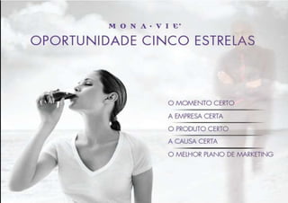 O documento descreve os produtos e oportunidades de negócios da empresa MonaVie, que atua no mercado de sucos nutricionais. A empresa opera atualmente em 22 países e oferece bônus e incentivos para distribuidores qualificados, como bônus de equipes, check match, pools de liderança e centros múltiplos de distribuição. O documento também apresenta metas iniciais para novos distribuidores começarem seu negócio.