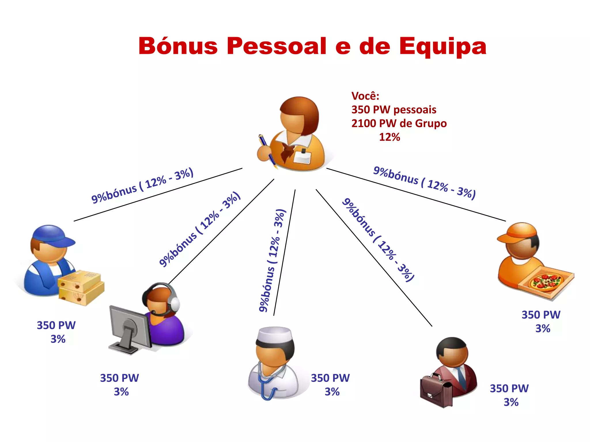 O documento descreve um bônus pessoal e de equipe. O vendedor vende 350 unidades por mês e recruta 5 pessoas que também vendem 350 unidades por mês cada. O vendedor recebe 12% de bônus sobre suas próprias vendas e 9% de bônus sobre as vendas de sua equipe. No total, o vendedor ganha €169,75 em bônus.