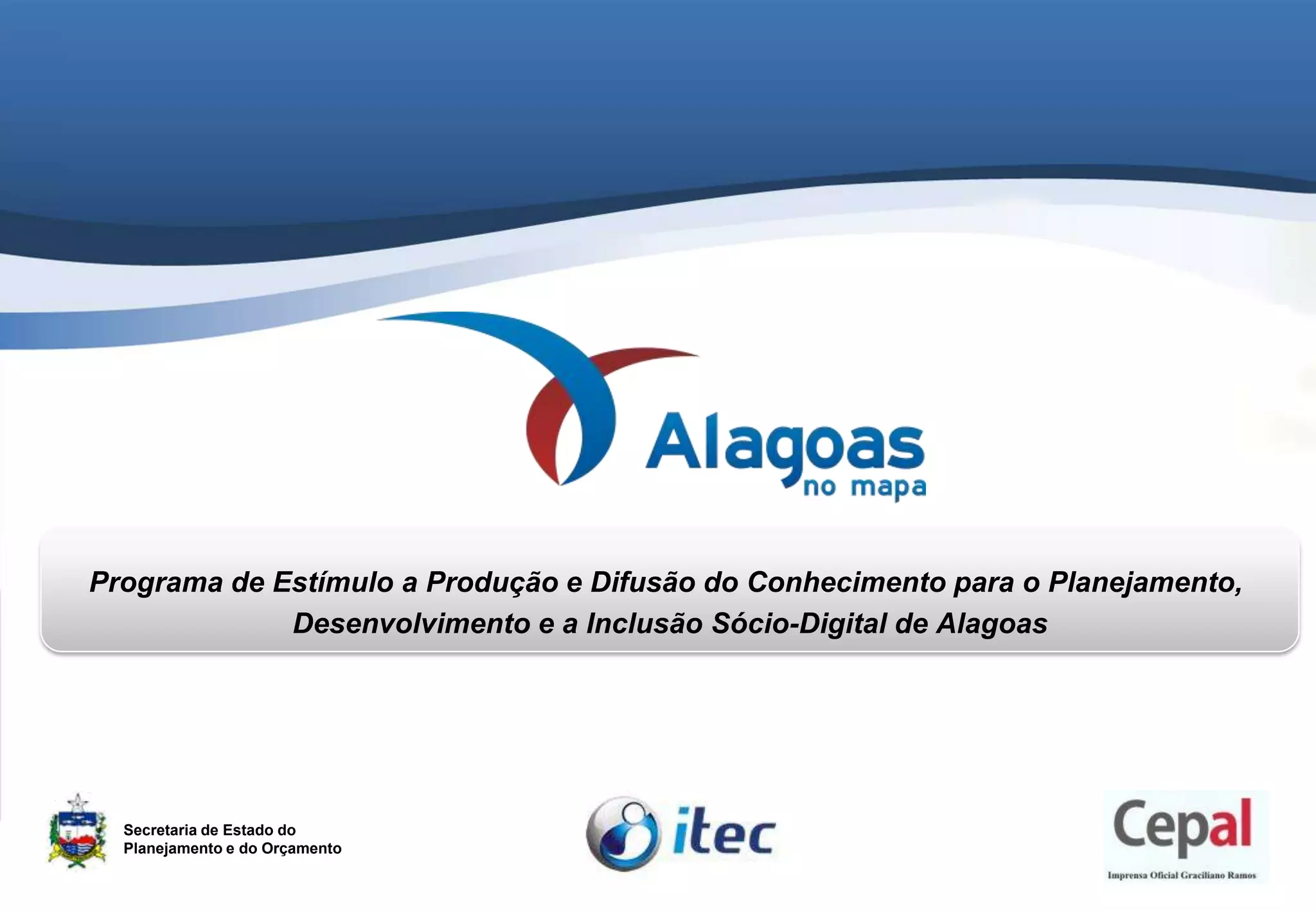 Este documento propõe um programa para promover a inclusão digital e a produção e difusão do conhecimento em Alagoas através de projetos como a criação de uma plataforma de informações, um portal de planejamento interativo e centros de inclusão digital para reduzir a exclusão digital e fortalecer o planejamento e o desenvolvimento no estado.