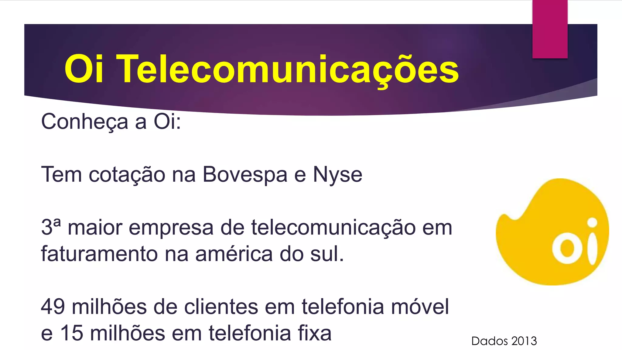 A Oi é a 3a maior empresa de telecomunicações da América do Sul com 49 milhões de clientes de telefonia móvel e 15 milhões de telefonia fixa. Ela oferece diversos serviços como telefonia móvel, fixa, banda larga, TV a cabo e cartão de crédito e possui cotação na bolsa brasileira e americana.