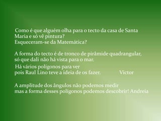 O documento descreve uma visita de um grupo de amigos à Casa de Santa Maria. Eles observam as várias formas geométricas presentes no teto e azulejos, incluindo octógonos, quadriláteros e hexágonos. Eles discutem como a matemática esteve envolvida na construção da casa e como pode ser divertida.