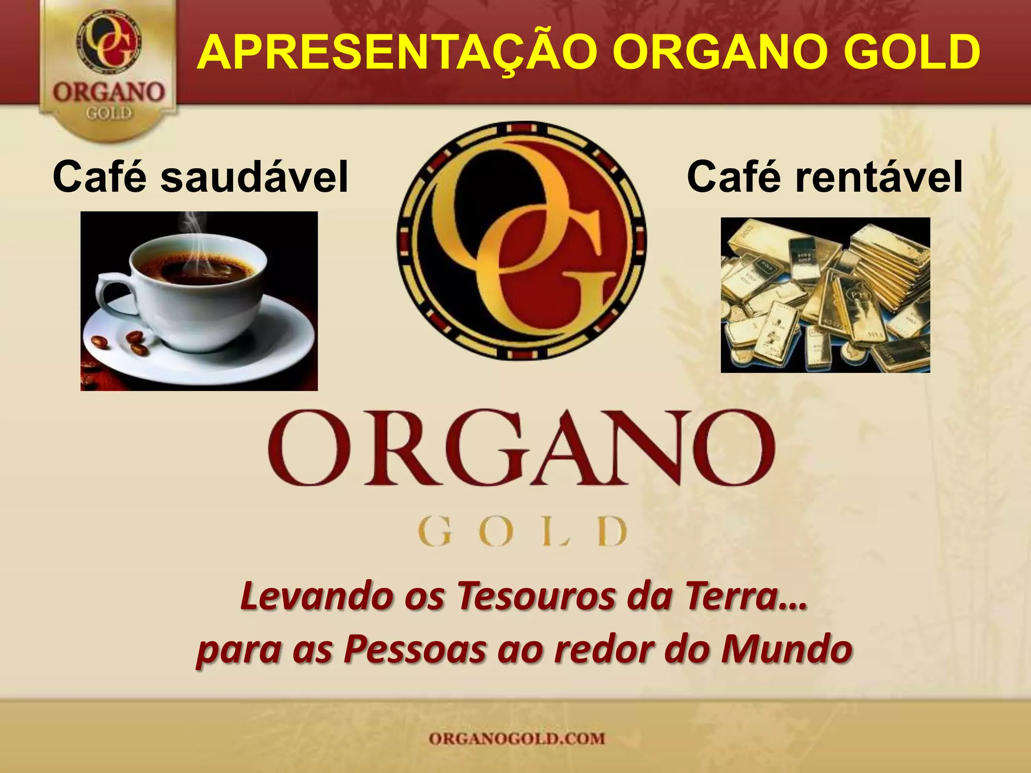 O documento apresenta a oportunidade de negócio da Organo Gold, uma empresa de café orgânico e suplementos à base de Ganoderma. A empresa oferece oito formas de ganhos através da venda de produtos e desenvolvimento de uma rede de distribuidores, incluindo bônus de início rápido, bônus binários, bônus unilevel e um programa de carros.