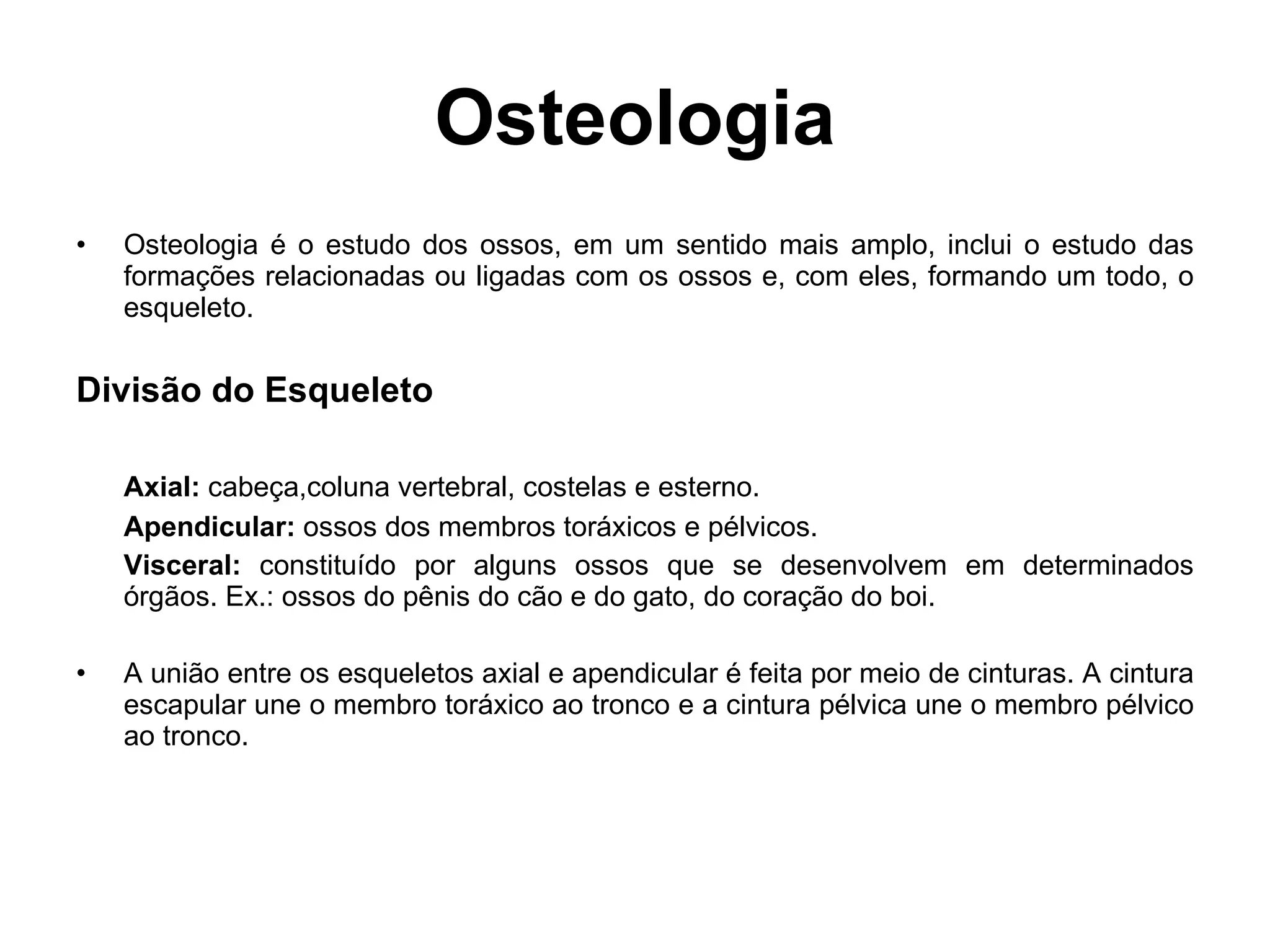 O documento descreve os principais ossos do esqueleto de animais, dividindo-os em esqueleto axial, apendicular e visceral. Detalha as principais características e partes dos ossos do crânio, como o occipital, esfenóide, etmóide, frontal e temporal, assim como ossos da face como maxilar, pré-maxilar e mandíbula. Apresenta também detalhes da coluna vertebral, cinturas escapular e pélvica e ossos dos membros.
