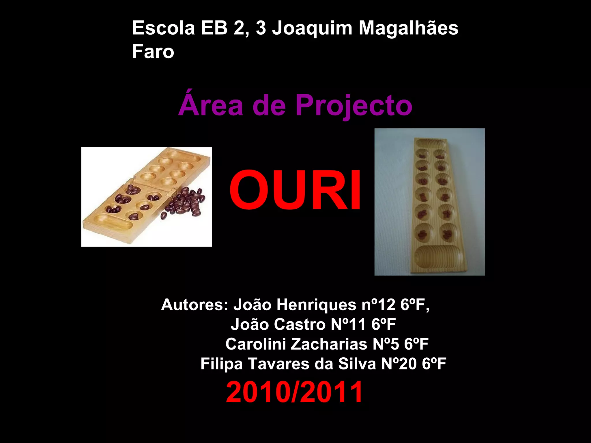 O documento aborda o jogo de raciocínio Ouri, originário da África e pertencente à família dos jogos de mancala. Ele detalha as regras do jogo, os materiais necessários para jogá-lo e o objetivo de arrecadar mais sementes que o adversário. Além disso, o trabalho foi desenvolvido por alunos com o intuito de aprender e ensinar o jogo, aprimorando suas estratégias.