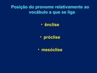 O documento discute as posições dos pronomes relativamente aos verbos no português, incluindo ênclise, próclise e mesóclise. Apresenta exemplos de cada caso e discute também as variações do português falado em diferentes países e regiões de Portugal, Brasil e Moçambique.