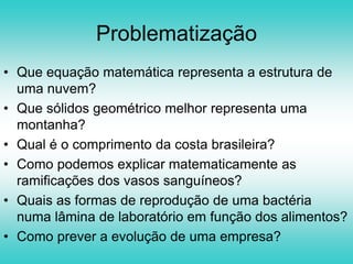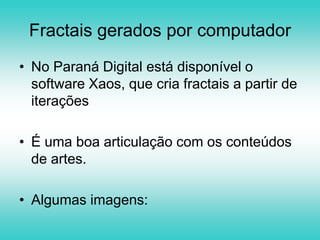 O documento explora a relação entre geometria euclidiana e não-euclidiana, com ênfase na importância dos fractais na matemática e no ensino. Discute a evolução do pensamento geométrico desde Euclides até contribuições modernas de Mandelbrot, abordando propriedades e aplicações dos fractais no contexto educacional. Sugestões de atividades práticas são apresentadas para integrar conceitos de fractais nas disciplinas escolares, promovendo uma compreensão mais ampla da geometria.