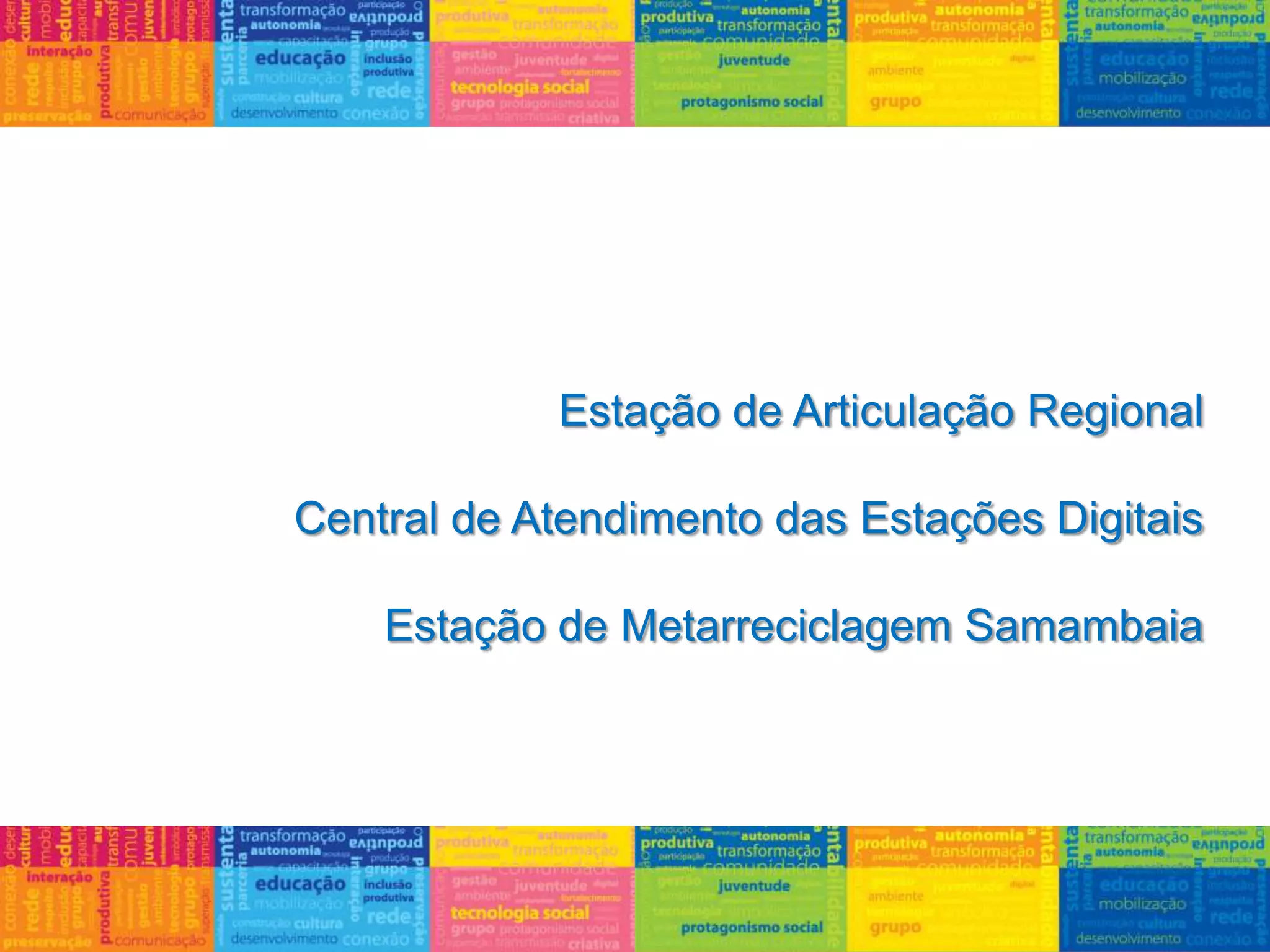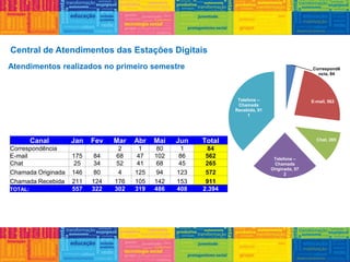 O documento resume as atividades e estatísticas da Central de Atendimentos das Estações Digitais e da Estação de Metarreciclagem Samambaia no primeiro semestre de 2013, incluindo atendimentos realizados, publicações em redes sociais, distribuição de kits de instalação e metas para o segundo semestre.
