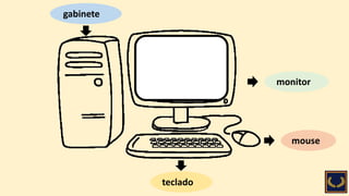 O documento descreve os principais componentes de um computador: o gabinete, que contém os componentes de processamento; o monitor, que mostra as saídas de informação; o teclado, usado para entrada de comandos; e o mouse, para controle do cursor na tela.
