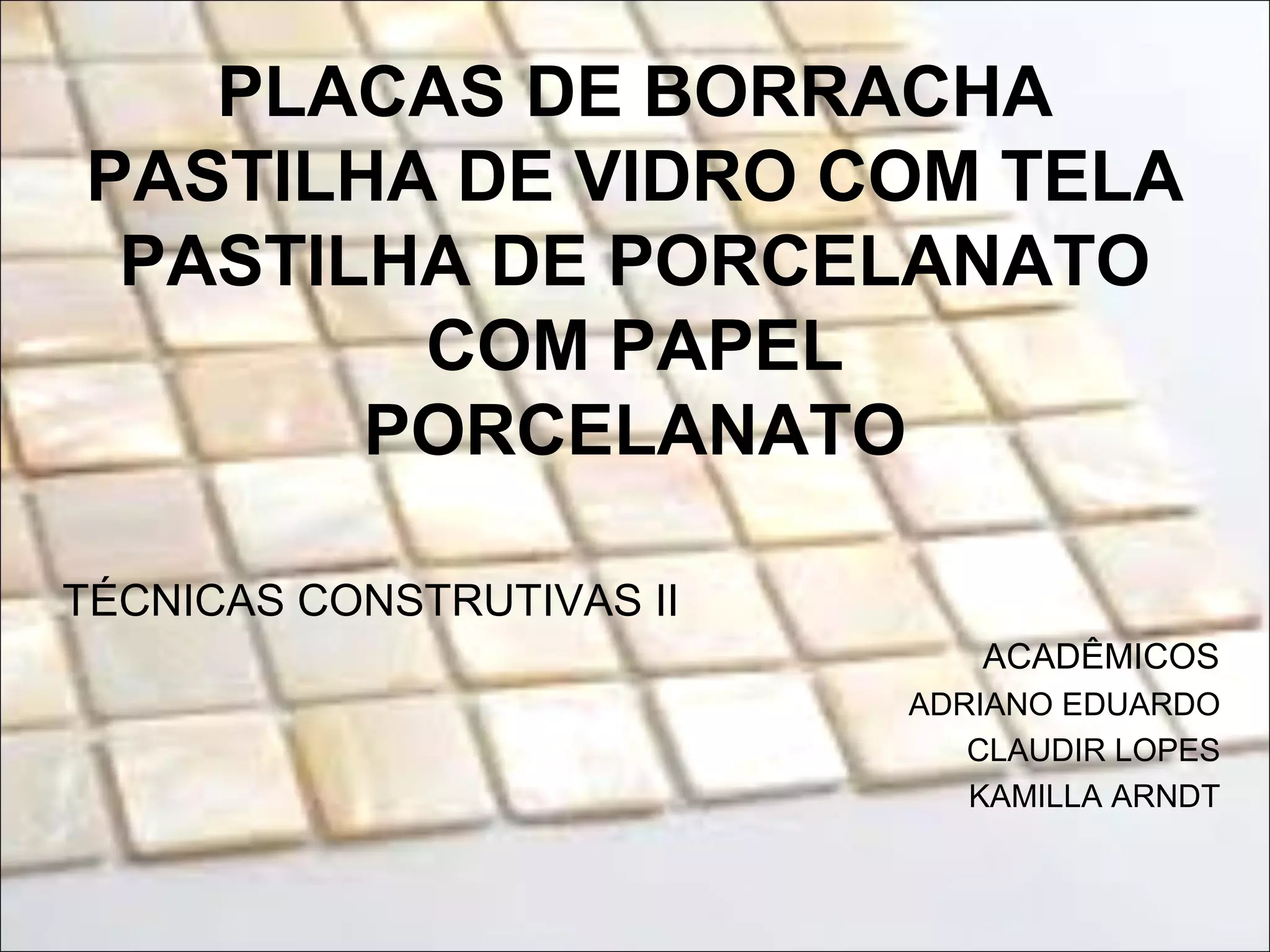 O documento descreve diferentes tipos de revestimentos cerâmicos, incluindo placas de borracha, pastilhas de vidro, pastilhas de porcelanato e porcelanato. Fornece detalhes sobre suas composições, propriedades, tipos disponíveis e métodos de instalação.