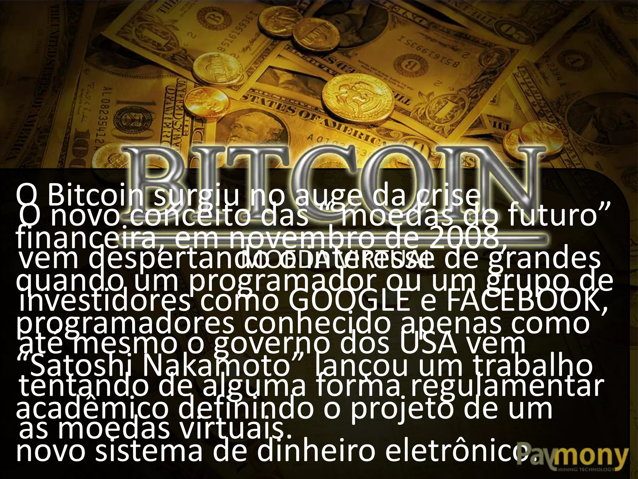 O documento descreve o surgimento e conceito de Bitcoin, moedas virtuais e como funciona a mineração e rede descentralizada de pagamentos P2P. Discute também como usuários podem adquirir, vender e minerar moedas virtuais de forma independente e anônima.