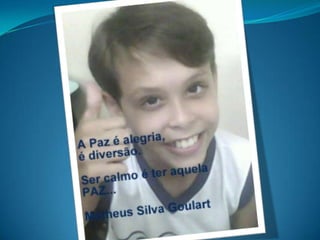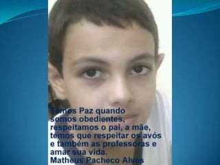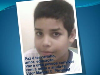 Os textos descrevem a paz como um sentimento positivo que traz alegria, felicidade e amor para as pessoas e a sociedade. A paz é representada como algo que vem do coração e une as pessoas, promovendo harmonia entre a família, escola, trabalho e o mundo. Quando a paz acaba, só resta a destruição.