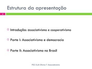 O documento apresenta uma introdução sobre associativismo e cooperativismo, seguido de duas partes principais: