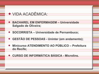 VIDA ACADÊMICA: BACHARELEM ENFERMAGEM – Universidade Salgado de Oliveira; SOCORRISTA – Universidade de Pernambuco; GESTÃO DE PESSOAS - Uninter (em andamento); Minicurso ATENDIMENTO AO PÚBLICO – Prefeitura do Recife; CURSO DE INFORMÁTICA BÁSICA - Microlins.