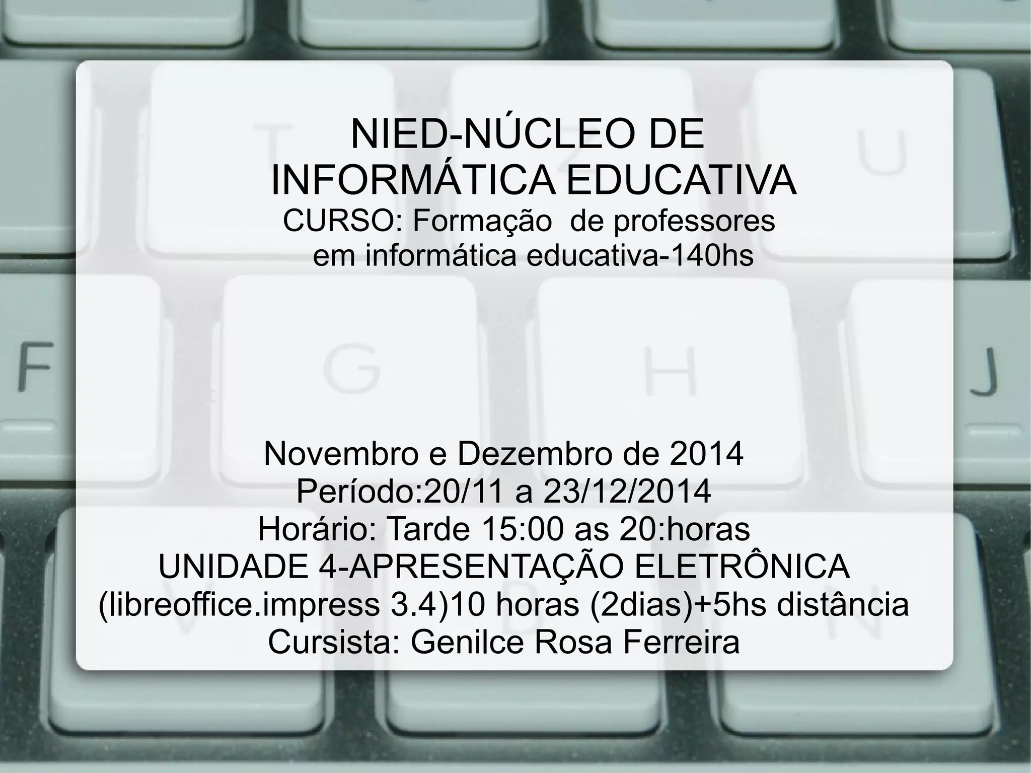 O documento apresenta o currículo de Genilce Rosa Ferreira para um curso de formação de professores em informática educativa com duração de 140 horas entre novembro e dezembro de 2014. Ele inclui seus dados pessoais, formação acadêmica, experiência profissional e projetos pessoais.