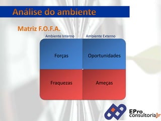O documento discute a importância do planejamento estratégico para as empresas, definindo seus conceitos e níveis. Apresenta a análise do ambiente interno e externo como parte do processo, assim como a definição de missão, visão e valores.