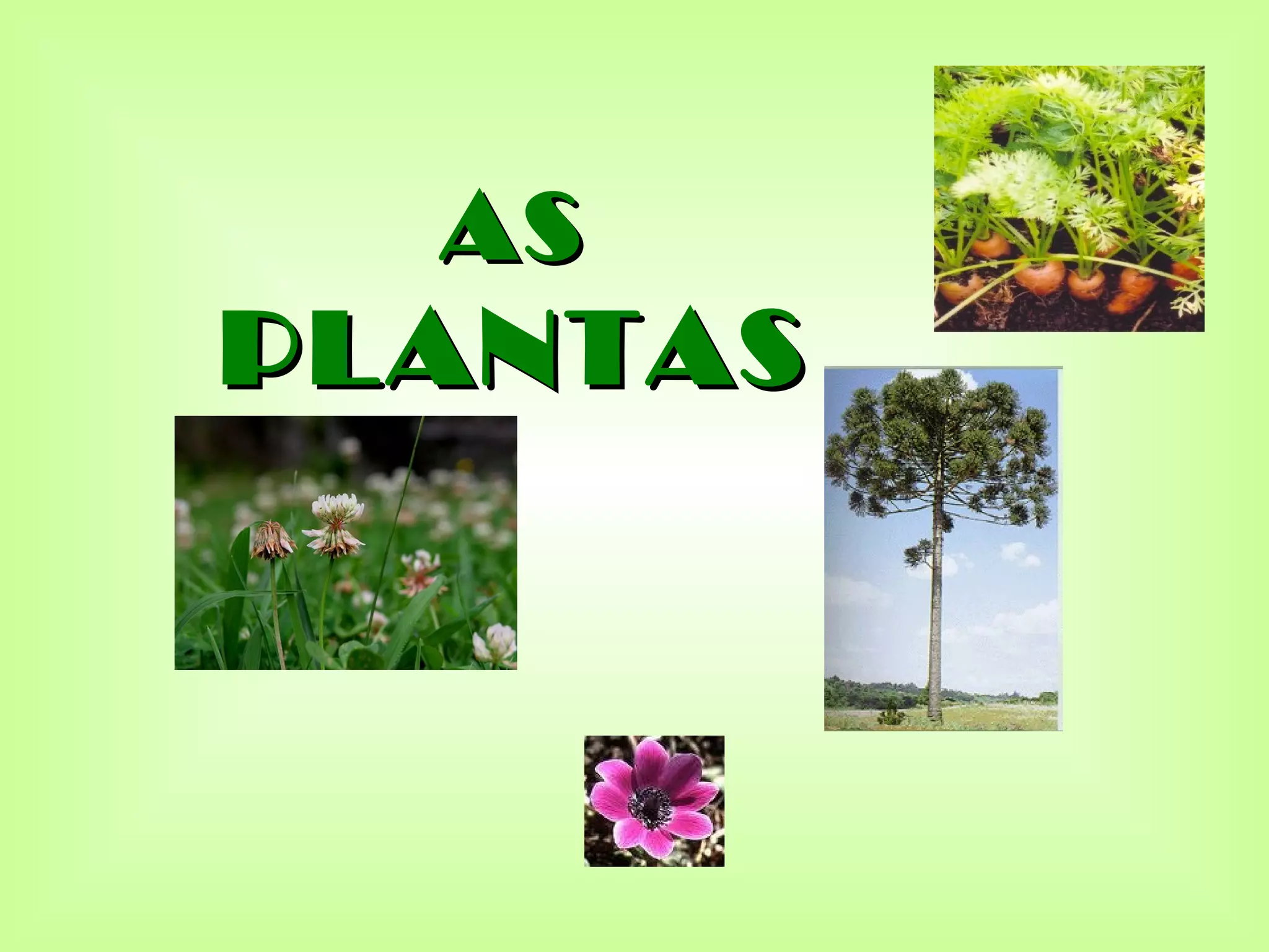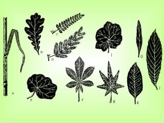O documento descreve as características básicas das plantas, incluindo seu tamanho, partes, tipos de raízes e folhas, formas de reprodução e utilidade. As plantas podem ser árvores, arbustos ou ervas, ter raízes fasciculadas, aprumadas ou tuberosas e folhas caducas ou persistentes. Elas se reproduzem por sementes ou estacas e têm diversos usos como alimentação, medicamentos e decoração.